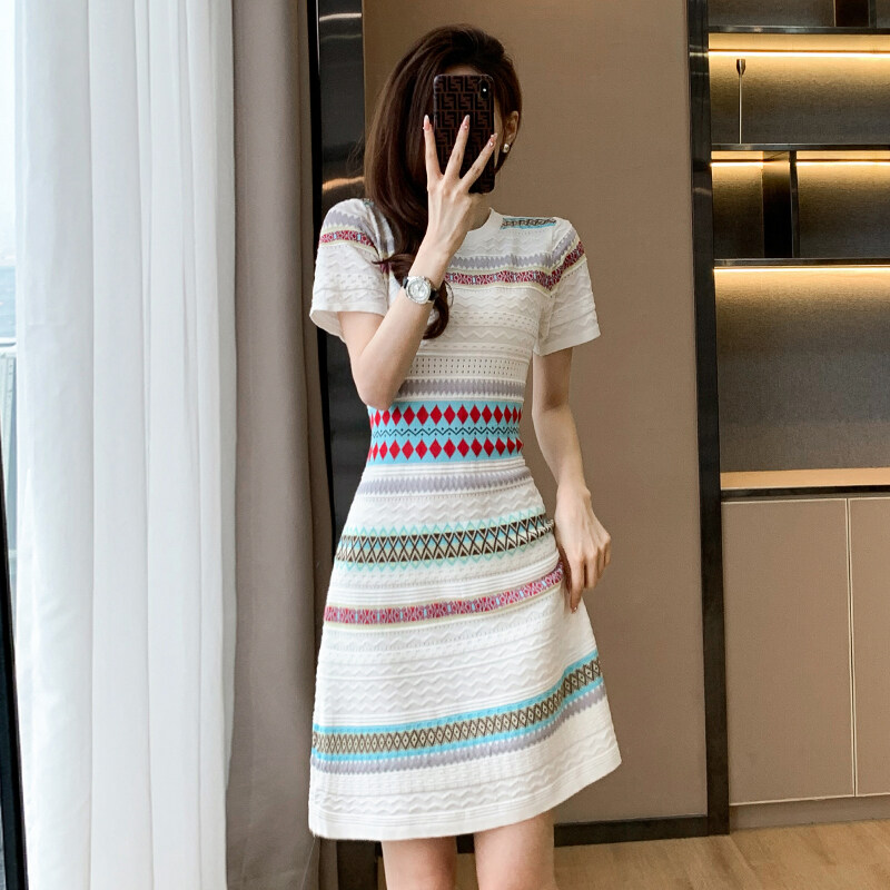 Missliu Fashion Women's Light Luxury Small Fragrance Dress Summer New High-End Elegant Striped Ice Silk Knitted Short Sleeve Skirt