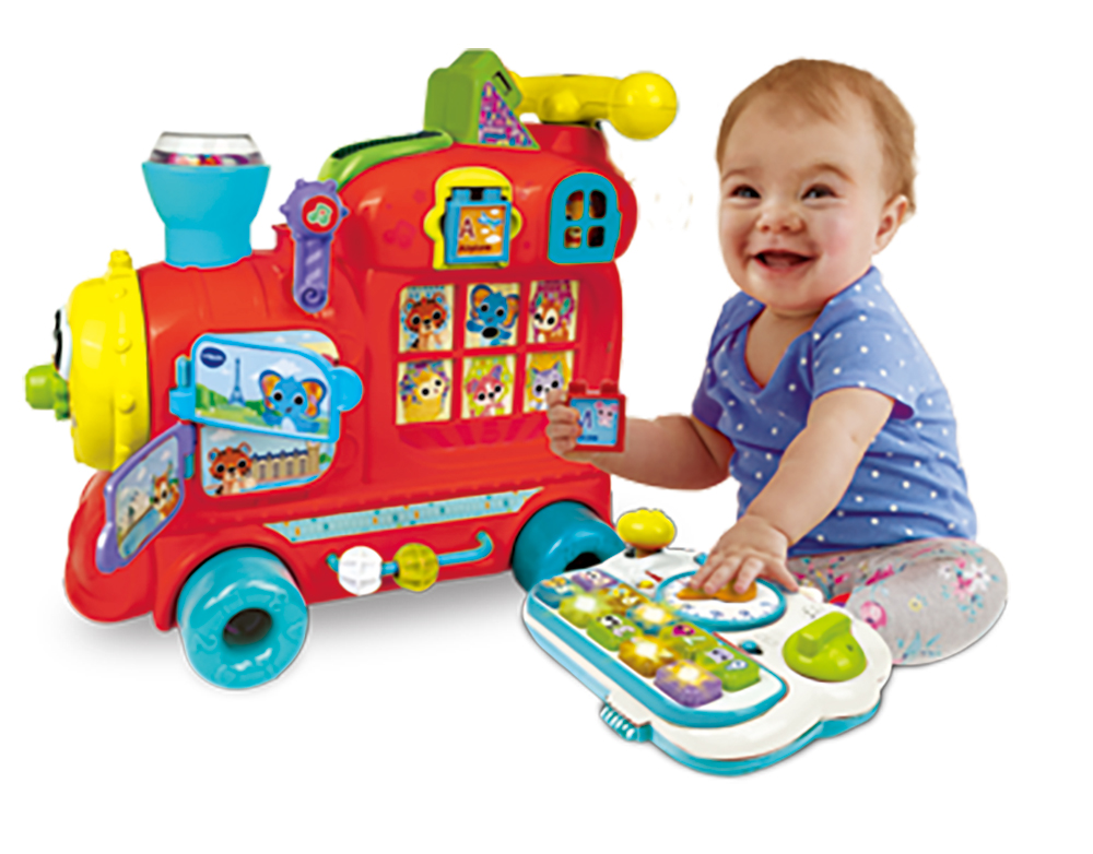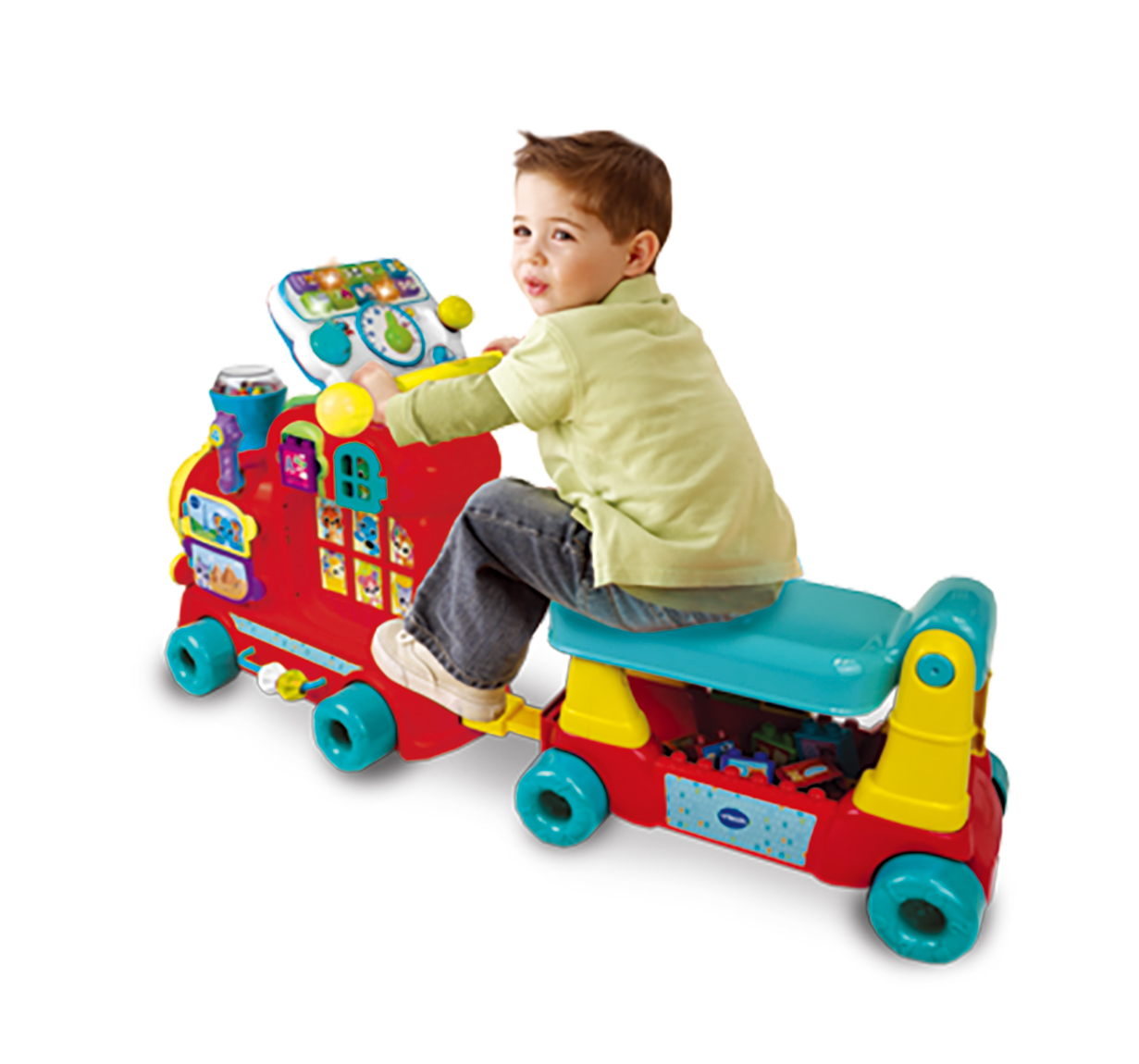 4-in-1 grow with me alphabet train includes modes for sit-down play, walker, pull-along wagon and ride on. Teaches objects, animals, phonics, colours, numbers and much more.
