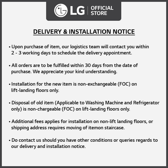 ● Disposal of old item (Applicable to Washing Machine and Refrigerator only) is non-chargeable (FOC) on lift-landing floors only.