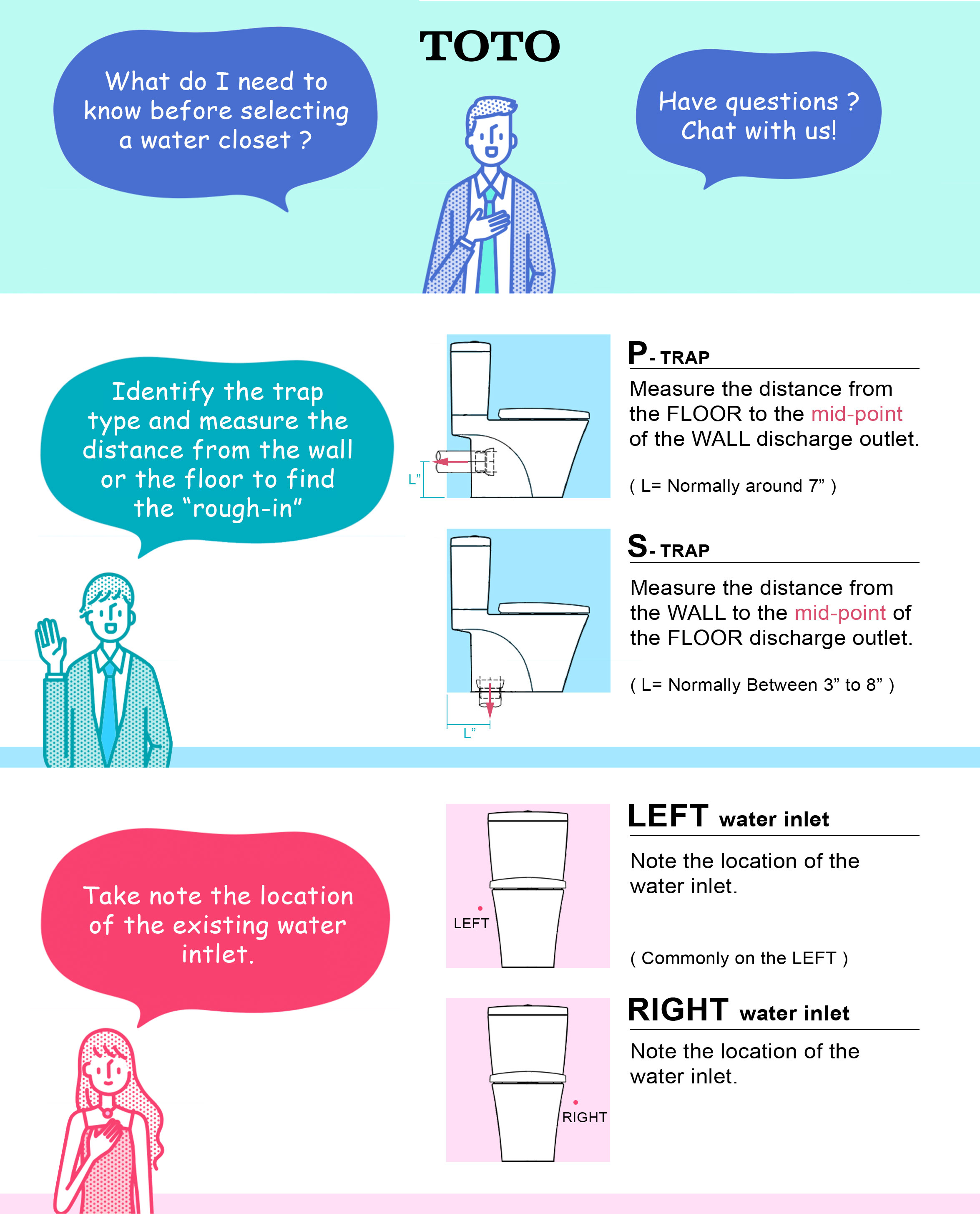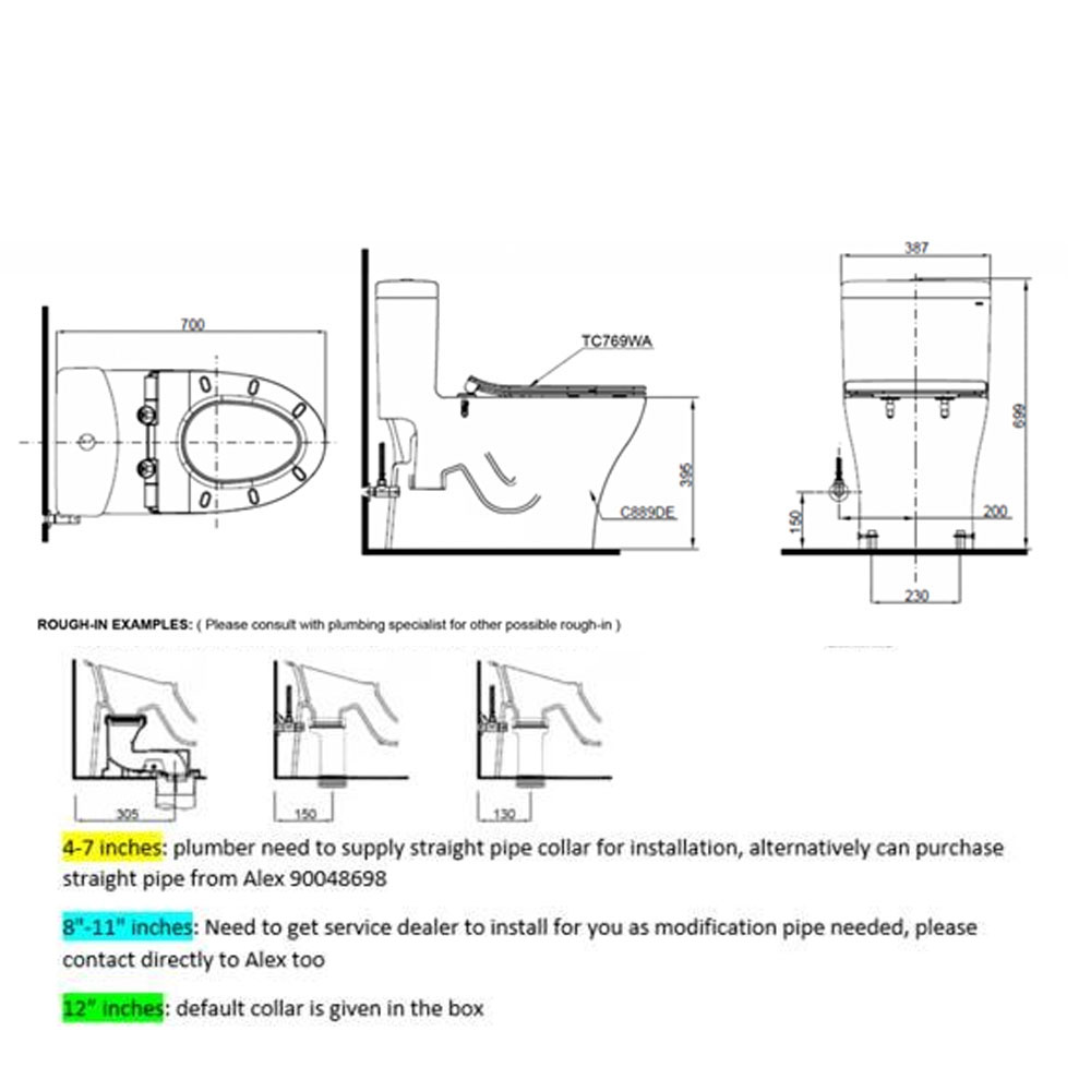 FREQUENTLY ASKED QUESTION:1.Are TOTO products approved in Singapore?All TOTO products are APPROVED for use in Singapore with minimum 2 ticks WELS rating.2.What is the warranty on TOTO products?TOTO warrants its products to be free from manufacturing defect during normal use when properly installed and serviced, for a period of 1 year from the date of purchase. 3.How do I find a certified plumber?We are able to recommend plumber to you. Please chat with us for more information. 4.What is a ROUGH-IN? Toilet ROUGH-IN refers to the distance from the finished wall to the centre of the toilet's floor drain or waste outlet. 5.How do I check my toilet ROUGH-IN?Please contact a certified plumber or consult with the building management for the records. 6.Can I install toilet with a different ROUGH-IN as my current?Depending on the toilet model, some allows for flexible ROUGH-IN connection. Please consult with us or a certified plumber.