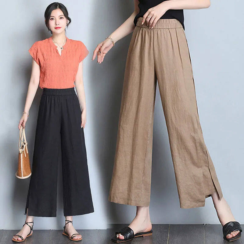 Wide leg pantsHigh waistedCotton and hempNinth pantsSimplified Commuting/Korean Version