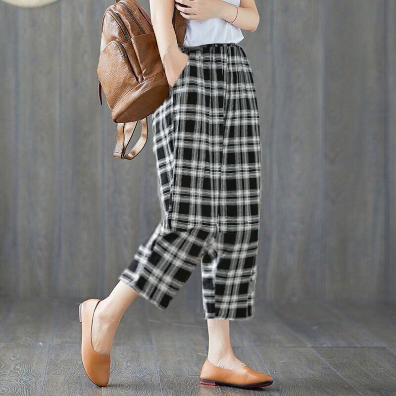 2024ac Summer Pure Cotton Mom Pants Middle-Aged and Elderly Gingham Cropped Pants Middle-Aged Harem Pants Print Casual Pants