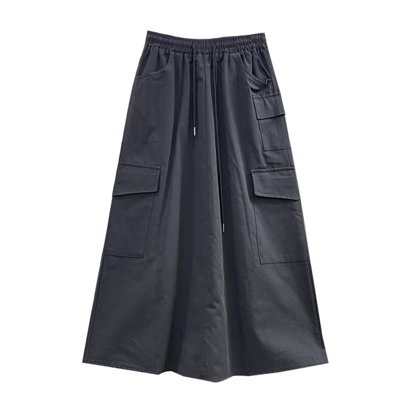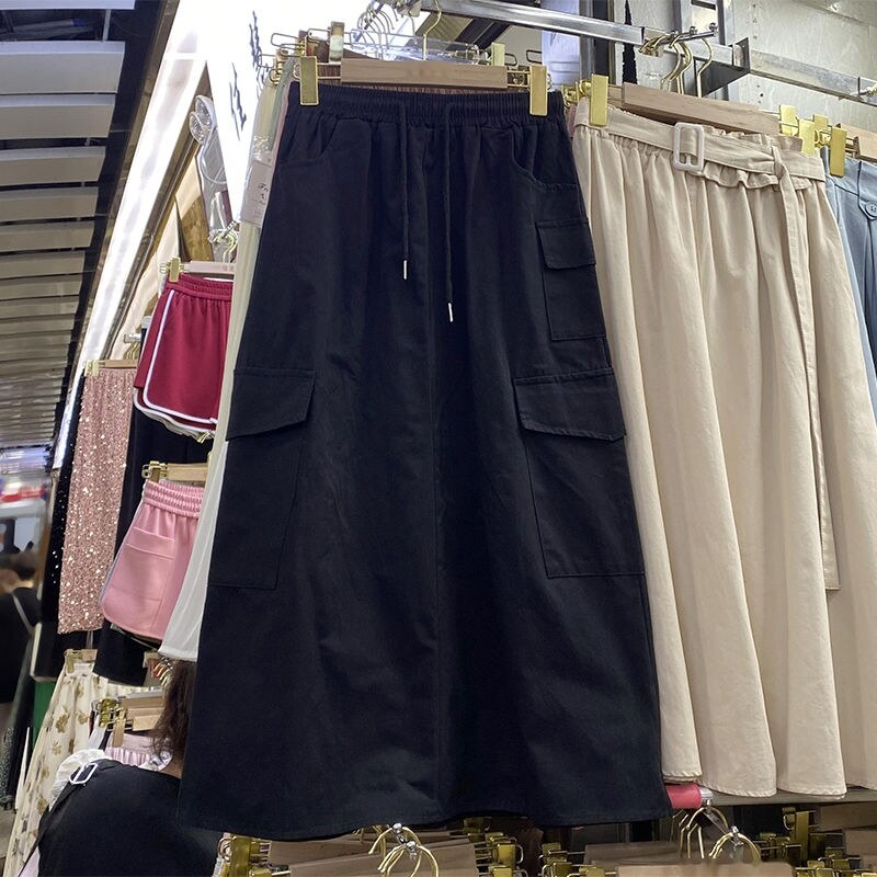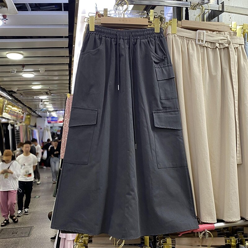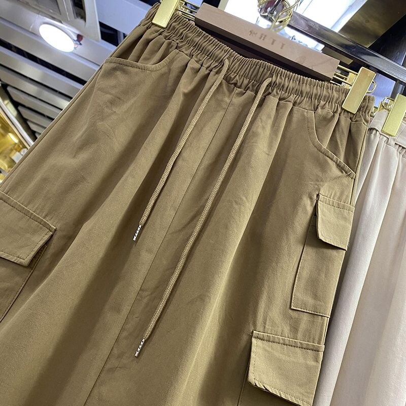 100.00kg Chubby Girl Summer K-style Women's Mid Length Long Length A- line Skirt Elastic Waist One Breasted Pocket plus Size Skirt