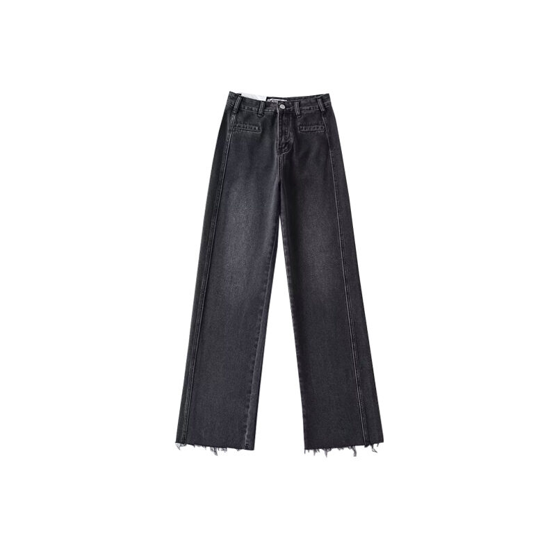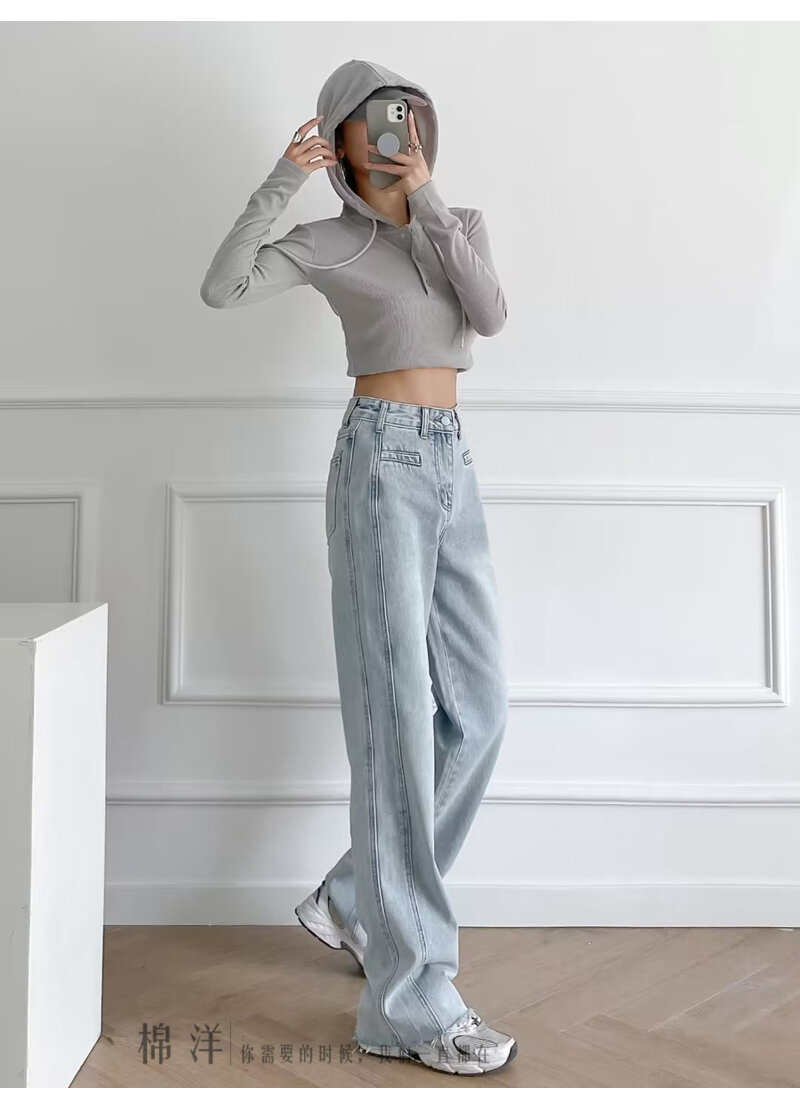 Cotton Ocean European and American Beauty Bloggers Retro High Street Style Loose Pants Patchwork Raw Hem High Waist Straight Mop Denim Trousers for Women