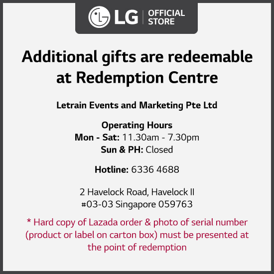 *Hard copy of Lazada order & photo of serial number (product or label on carton box) must be presented at the point of redemption (Redemption @ Letrain).