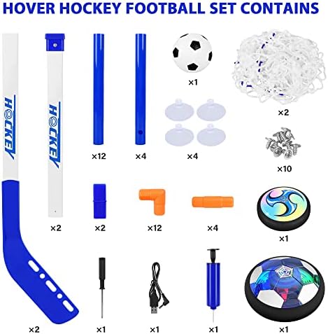 Valuable Hover Hockey Set for Kids: Includes 2 rechargeable hover soccer balls, no need batteries,1 inflatable soccer and 1 inflatable basketball, inflate the ball with the pump,2 hockey sticks, 2 goals and 1 rechargeable cable, a Mini Screwdriver Special Design and Easy to Assemble: The hover ball has multi-color LED lights built in, which can enhance the feeling of fun, This brilliant light can easily grab children's attention and keep them occupied for hours. Multiplayer Game and Enhance the Relationship: Powerful fan floats allow the ball can slide on any flat floor perfectly, including hardwood floors, tile floors, basements, and even low-pile carpets, Kids can not only play with hockey toys but also play them as ice hockey, knee basketball set, soccer hover ball, soccer toys, Kids can also compete with friends and parents to enhance the relationship. Ideal gift: Color packaging, Develop sports skills, collaborative games and social skills, rovide time for enjoyment and exercise for kids.The best choice for children's birthday gifts or Christmas gifts.Suitable indoors or outdoors, perfect for children to enjoy the perfect holiday. ⚽? The hover soccer set for kids allows kids to play in various ways as it glides perfectly on any smooth surface. Kids can play them as hockey toys, soccer hover balls, soccer games, and bowling ball games. In twos or as a multiplayer practice kickback toy with their dog. Excellent soccer games for toddlers 3,4,5,6,7,8 etc