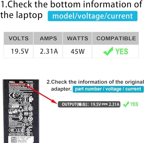 【 FEATURES 】: Strong, durable construction and compact design. Charges your device at maximum current and full speed. Charging will automatically stop when battery is full. 【Rated Power】: Input: 100-240V, 50-60Hz~1.5A Output:45w 19.5V 2.31A Plug size: 4.5mm*3.0mm 【Compatibility】: Dell Inspiron 11/13/14/15/17 3000 5000 7000 Series(3583 3593 5570) Latitude E5450 XPS 13-45 Watt AC 2-in-1 【Here’s What You Get】: 1 x power adapter, 1 x high-quality AC cable【SAFETY RELIABILITY】All of our product lines are put through rigorous quality control procedures to ensure safe, reliable operation for years to come. We guarantee our products will charge your device as efficiently as the original charger, or any other replacement. 【GUARANTEE】: Within 30 days of purchase, we offer a no-questions-asked full money back guarantee. Additionally, for 2 years from the date of purchase, we will exchange your product free of charge should it become defective.