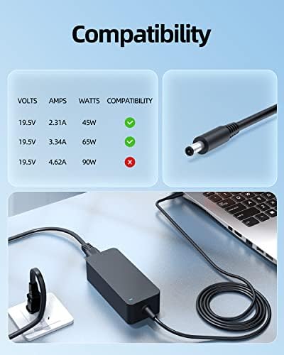 ⚡# Certified Safety # --- Certified and listed by the nationally recognized electronics safety expert UL. Only products with the top quality, workmanship & safety level in the industry can pass the extremely stringent quality tests to obtain this honorable certification. ✅# Flawless Compatibility # --- Exclusively designed switchable round connectors will fit ALL Dell laptops of 65W, 45W, with round power connectors, e.g. Dell Inspiron 15-3000 15-5000 11-3000 13-7000 14-3000 13-5000 15-7000 17-5000 Series & More. ?# Worry-Free Warranty # --- Full refund or replacement within 30 days of purchase if unsatisfied anytime for any reason. An additional 2 years warranty and dedicated customer support are right at your service. ?# Other Specs # --- Output: 19.5V 3.34A 65W (Fit for Dell laptops of 65W, 45W ), Input:100-240V, Additional Features: Charging Indicator.