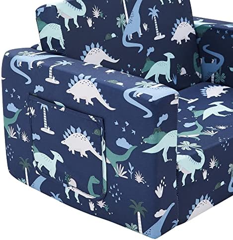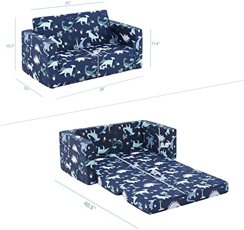 Ulax furniture Kids Fold Out Couch 2-in-1 Children Convertible Sofa to Lounger with Soft Plush Fabric(Navy Dinosaur)