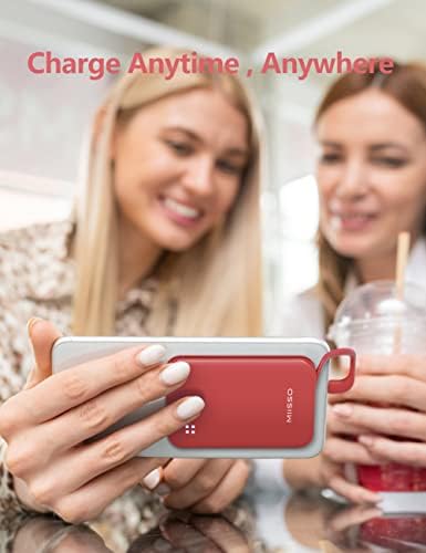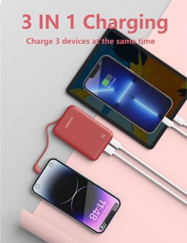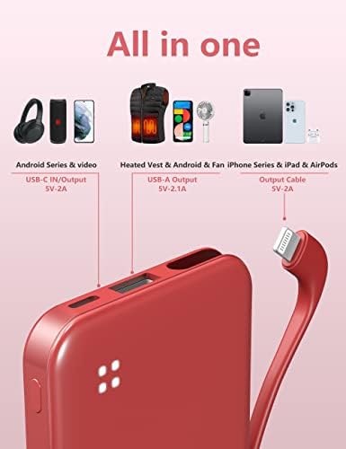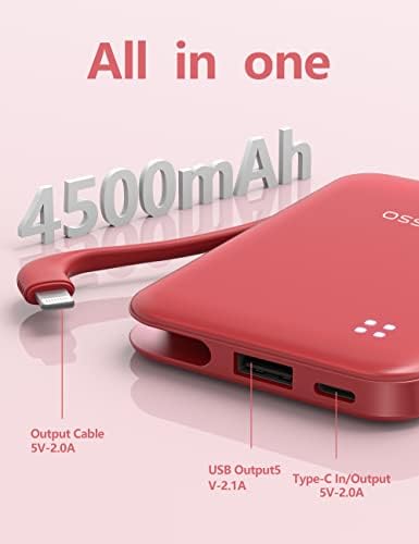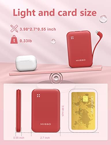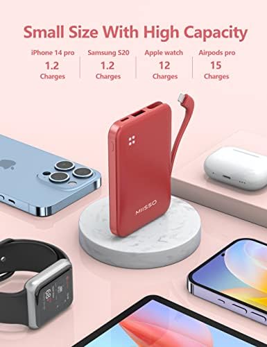 miisso 4500mAh Built in Cable Cell Phone External Battery Pack, Portable Phone Charger Power Bank 5V 2.1A Charging Mobile Phone Charger USB-C in/Out Compatible with iPhone 6/7/8/X/11/12/13/14, Red