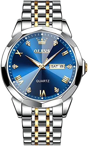【Men's Wrist Watch:】Imported Movement, high quality quartz movement and battery provide accurate time keeping,Solid Durable and comfortable stainless steel band fits to daily wear,scratch proof mineral glass dial. 【Luxury Fashion Design:】 The blue watch for men with its rhombic coated glass mirror,bling diamond dial,stainless steel case and band, Case diameter:41mm. Case thickness:11mm. This classic fashion simple dress wristwatch will be greatly suitable for any occasion. 【316L Stainless Steel:】 Two tone strap designed to make the man watch more fashionable and luxurious, durable and corrosive, and still maintain shiny after long -term use.If it is too short, we can watch chain links for free. Provide adjustment tools to easily adjust the belt length. 【3ATM Waterproof and Luminous:】 Water resistance up to 100 feet(30 meters) which is suitable for everyday use such as daily use/rain resistant, but it cannot swim or take a hot bath.Luminous display function.When Using the Night Light Function for the first time, Illuminate the Male Watch for 30 Seconds Under the Light or adsorb the sunshine to Activate the Light Function. 【OLEVS Warranty Service: 】We provide 24 months warranty and 30-day money back guarantee.If you have any problems during the use of the business watch, please contact us at any time. We will provide you with professional services