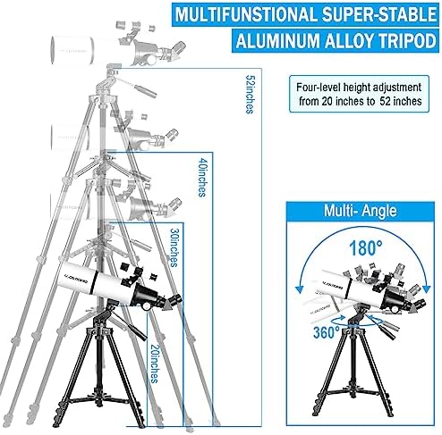 【Excellent Optics】Astronomical telescope features 80mm aperture 600mm(f/6.7) focal length-The big aperture can capture more light; high transmission multi-fully coated optical lens can improve light transmittance, reduce the reflection of light. It will bring you more bright and clear images. 【Portable & Stable】Our refractor telescope has a backbag, an adjustable aluminum tripod and an upgraded phone adapter. All accessories can be packed into the bag, which is convenient for you to carry and storage for traveling. The tripod is stable and the height can adjust from 17.7" to 52", which is suitable for adults and kids. With the phone adapter, you can take amazing photos through your phone. 【Easy to Operate】 This telescope is easy to assemble even for astronomy beginners and kids. You can set up easily with the detail installation manual and video. No tools are required. It’s a great astronomy gift telescope for adults, astronomy enthusiasts, beginners and kids 8-12. 【Optimum Magnification】Our telescope for kids and adults is equipped with two replaceable excellent-quality eyepiecesa (20mm and 9mm) for 30X and 66X magnification. A moon filter transmits only 13 percent of the incoming light and improving contrast. Also with 5x24 finderscope, you can locate objects easily. A great option for astronomy lovers to explore the moon, Saturn and Jupiter. 【Satisfaction Service】We provide 3 years satisfaction service. If you have any questions about the product and service, please feel free to contact us to get 24-hour technical support from our expert team. Whether observing moon or viewing planets, our telescope can meet your all needs. It’s a great telescope for adults & 8-12 kids & astronomy beginners.