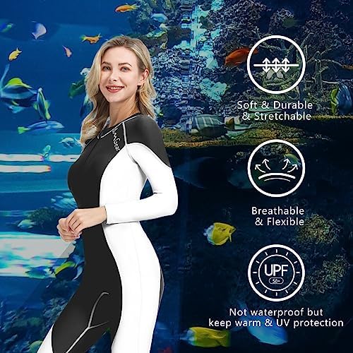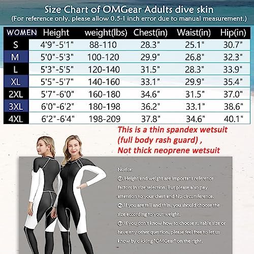【Super Stretchy Spandex Fabrics】:OMGear full coverage swimsuit are made by 80% nylon and 20% spandex,which is super stretchy and breathable.Unlike wetsuit made by neoprene,material of this diving suit is thin and quick-dry.It is durable,quick-dry and comfortable for a long service life. 【Full Body UV Protection】:OMGear full piece rash guard is made by fabrics with UPF 50+ coating ,so it is UV protection,can protect your skin from sun burning.In addition,OMGear full body snorkeling suit can protect you from jellyfish,coral reef,or other oceanic irritants.Though it is not same thermal as the neoprene wet suit,but somewhat this thin dive suit can keep you warm. 【Slim Fit and Front Zipper Dive Skins】:Slim fit swimwear is close to your skin,feel like a second skin, naturally form fitting to reduce drag in the water, offers no restrict movement ensures you freely move underwater. OMGear full swimming suit with long front zipper is easy to put on and take off, perfect for using in swimming pool,river,lake,sea and beach. 【Must Haves for Watersports】:A sun-resistant stretchy full body dive skin is perfect for swimming ,kayaking ,surfing ,snorkeling, scuba diving, freediving, boating ,spearfishing, sailing, wakeboarding, paddling ,canoeing, rafting, jet skiing, river trekking ,fishing, beach, boardboarding, lobstering, crabfishing, whitewater and other watersports or outdoors activities. 【Satisfaction Policy】:Every OMGear full body long sleeve surfing rash guard are under strict QC standard before shipment. Please contact OMGear after-sales service team if you have any issues with this diving skin, we will reply you ASAP. We promise we will provide a 100% satisfactory solution for you.