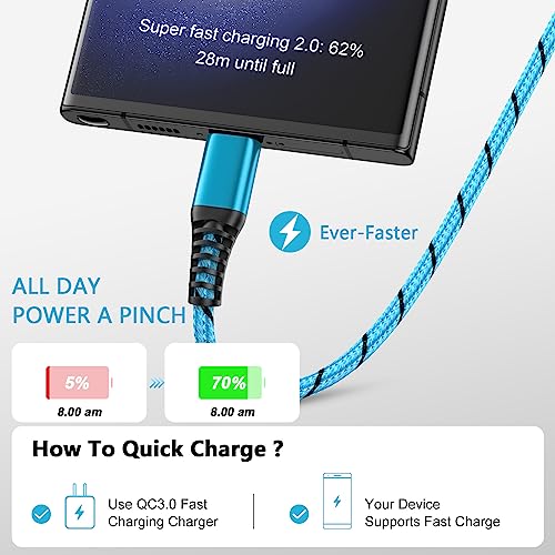 3A FAST CHARGING & SYNC: USB-C to USB A Cable Support High Speed 3A USB-C Charging for devices compatible with Quick Charge and Data Transfer speed up to 480Mbps, 25% faster than conventional samsung charger fast charging cord DURABLE SAMSUNG CHARGER CABLE: Samsung Galaxy A54 5G Charger Cable Fast Charging covered by premium quality braided nylon jacket can bear 10000+ bending test, durable enough to withstand heavy usage 6FT LONG USB C CABLE: 6Feet USB C Cable Samsung Galaxy A14 5G Charger Cord is convenient to use in different occasions, such as bedroom, sofa, office and even at the backseat of your car. Reversible design makes the Samsung A54 Charger easily insert into any Type-C enabled devices FAST CHARGER TYPE C FOR SAMSUNG: Type C Charger Fast Charging Cord for Samsung Galaxy S24/S24+/S24 Ultra/S23 FE/S23/S23 Ultra/S23+/S22/S22 Ultra/S22+/S21 FE/S21/S21+/S21 Ultra/S20 FE/S20/S20+/S20 Ultra/Note 20 10 9 8/Z Flip 5 4 3 5G/Z Fold 5 4 3 2/S10E/S10/S9/S8 Plus A15 A14 A54 5G A03S A13 A23 A53 5G A02S A12 A32 A42 A52 A11 A21 A51 A71 A10E A20 A50 A70, Google Pixel 8 Pro 7a 7 Pro 6a 6 Pro 5a 5 4a 4 XL 3a 3 XL 2, LG Stylo 6 5 4 V60 ThinQ K51 Velvet, Moto G Stylus 5G 2023/G Pure/G Power/G Play WHAT YOU GET: 2Pack 6 Feet Samsung Charger Cord Type C ( 1 X 6FT Blue Android Charger Cord Type C, 1 X 6FT Purple Android Charger for Samsung ). 7 X 24 Hours Reliable and Friendly Customer Service, 12 Month Warranty #5,820 in Cell Phones & Accessories ( ) #378 in
