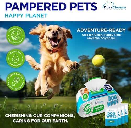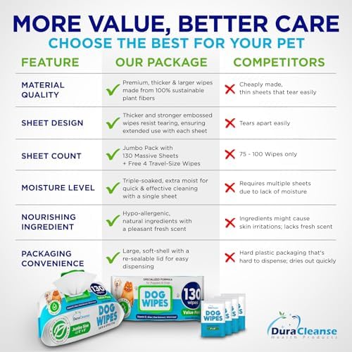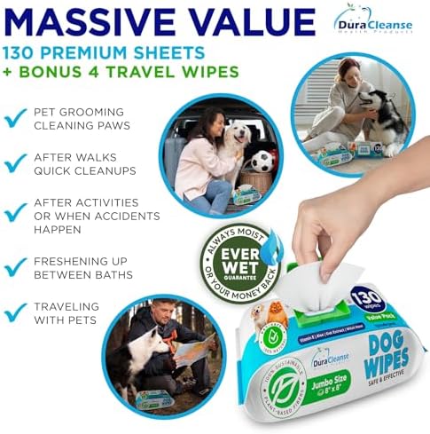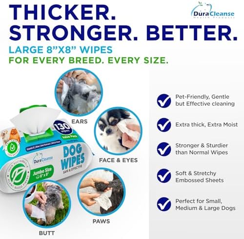 Dog Wipes for Paws and Butt - 130 Count + 4 Travel Puppy Wipes - 8" x 8" Large Dog Grooming Bath Wipes | Hypoallergenic Dog Face Wipes, Extra Thick Cleaning Deodorizing Pet Wipes for Dogs, Cats, Pets