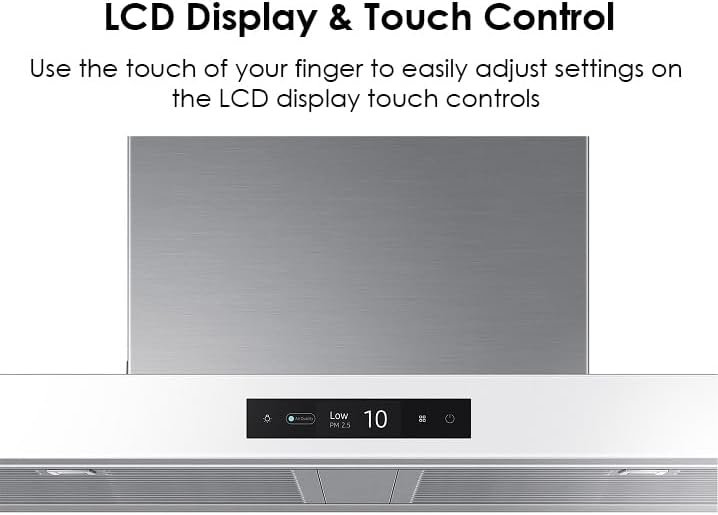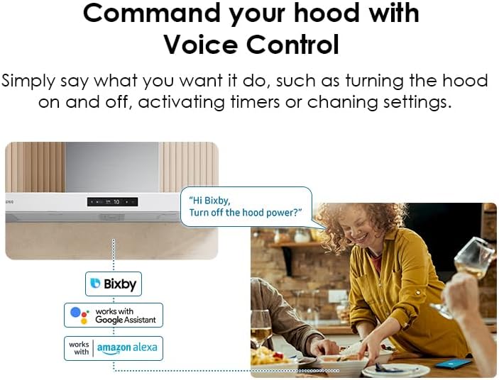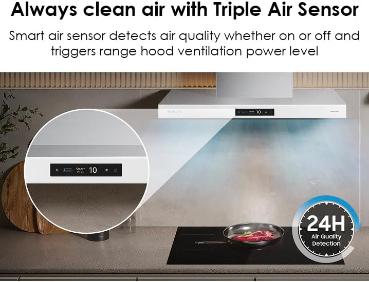 BESPOKE DESIGN: Available in a variety of Bespoke colors¹ to complement other appliances and express your personal style. Whether you prefer to match, complement or contrast – the choice is yours TRIPLE AIR SENSOR: A quiet hood that helps you cook with almost no noise at 50 dBA and has smart air sensor to keep air quality detection all day long WI-FI CONNECTIVITY: Monitor and control the hood anytime, anywhere using the SmartThings App on your smartphone; Automatically turns on once your cooktop burner is powered on VOICE CONTROL: Control your hood by voice when you’re busy doing other things by using your favorite virtual assistant, whether it’s Samsung Bixby, Amazon Alexa or Google Assistant LCD DISPLAY & TOUCH CONTROL: Use the touch of your finger to easily adjust settings on the LCD display touch controls