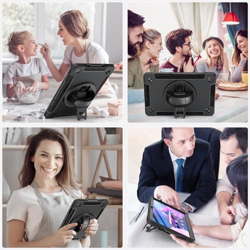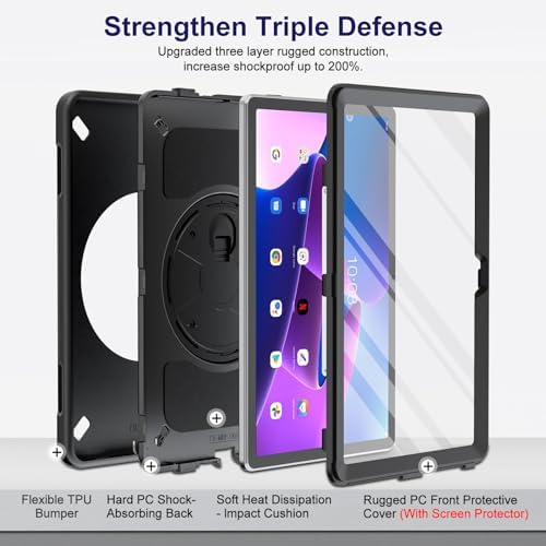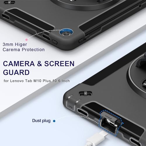 Compatible with Lenovo Tab M10 Plus 3rd Generation 10.6 Inch 2022 (Model:TB-125F/TB-128F) with Screen Protector. Three-Layer shockproof case has passed the Military Grade Drop Test.The Lenovo Tab M10 Plus 10.6" Case is made of 2 high-quality PC(Inner shell) and 1 soft flexible TPU(outer cover). Built-in sponge technology adds extra cushioning. Built-in 360-degree rotating stand supports in vertical/horizontal positions 3 angles (vertical, horizontal, middle). It can be used to support the Lenovo Tab M10 Plus 3rd Gen when watching movies, playing games, or typing, let your hands-free. Precise cutouts are designed for easy access to all buttons, controls, and ports, the case's port plugs keep dust out of the Lenovo Tab M10 Plus 10.6 and the micro design of the raised bezel above the screen/camera provides extra protection. The ergonomically adjustable hand strap is more easily gripped, and the matte coating prevents slipping out of your hand. A portable shoulder strap ensures maximum portability wherever you go. Release your hands completely during hiking, traveling, or other outdoor activities.[Miesherk provides 12 months warranty and after-sales service]